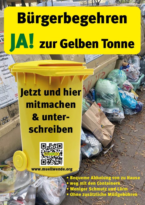 hat diese Presserklärung veröffentlich und unterstützt unser Bürgerbegehren für das Holsystem mit der Gelben Tonne oder besser der Wertstofftonne, in der alles aus Plastik und Metall für eine Wiederverwertung gesammelt werden kann.